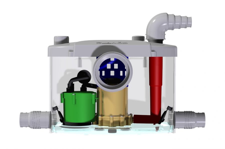 La cassetta contiene un potente e silenzioso maceratore che permette di scaricare attraverso una tubatura di diametro ridotto, fino al più vicino discendente fognario.